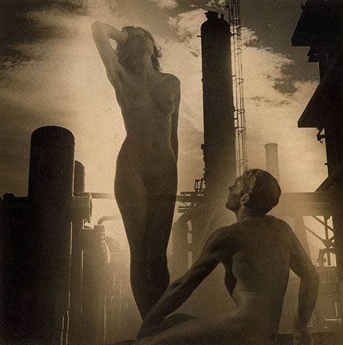 One such image was The Progenitors (plate 2), which uses themes of man versus machine and human reproduction. A man gazes up at a woman who is in turn looking to the heavens, both are nude. This image is superimposed over a photograph of a factory, implying the battle that man has with machine and his supremacy over machines. The image also implies humanity and the divine right of man to conquer the world and reproduce as needed.