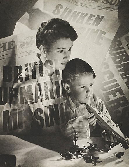 One of his most famous montage images at the time was used as a poster to promote the war and recruiting (plate 3). However, it was quickly recalled when people realised it had an anti-war effect with its depiction of a beautiful yet sad women and a child playing with toy submarine and soldiers. This image was super-imposed over newspaper headlines that announce missing or sunken submarines, giving a sense of the loss that war can bring. |