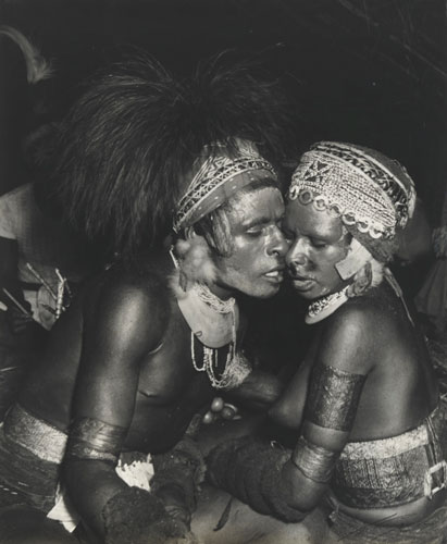 This image depicts an intimate mating ritual among young New Guinea boys and girls, where they rub noses and cheeks with each other. A sense of the couple's awkwardness in the ritual and the obvious importance of the ritual to the tribe can be clearly seen in the image. This ceremony had not been documented before, nor indeed many of the highland areas where few white people went. The photograph was one of two Australian images which were later included in Steichen's Family of Man exhibition in New York.