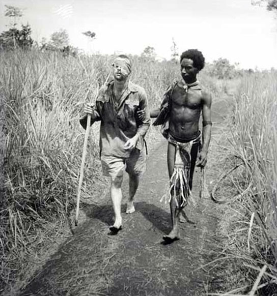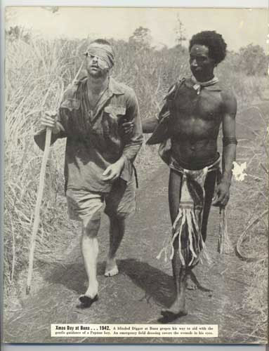 The image shows twenty-three-year-old Private George Charles Whittington of the 2/10th Australian Infantry Battalion with both eyes bandaged having been wounded in the battle for Buna airstrip the day before. He is being led to an AIF field hospital at Dobodura by Raphael Oimbari, a Papuan Papuan recruited as a carriern orderly by ANGAU (Australian New Guinea Administrative Unit).