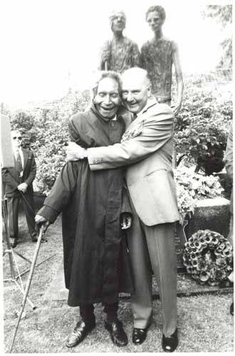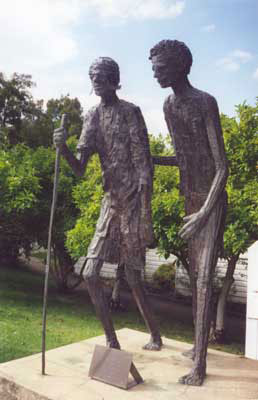 The Canberra Services club sculpture is rendered in a semi abstract style with heavy texture and elongated thin forms that Swiss sculptor Alberto Giacometti made famous in works such as his 1960 ‘Walking Man’. The sense of the two men walking in step has been diminished and the sense of connection as Oimbari watches Whittington as well as the track ahead. The contrast of Oimbari’s lithe naked body and the wounded man is also lessened.