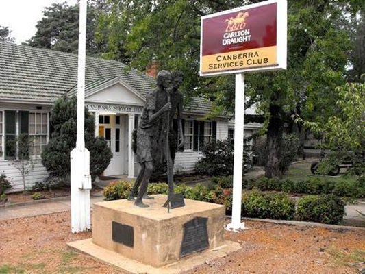 The Canberra Services Club burnt down in 2011. As of 2024, the statue stands forlornly in front of the vacant property, with that large tank threatening - on a very busy corner.