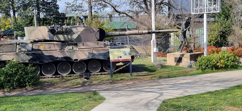 View of Canberra Statue in 2023 - with tank close by.