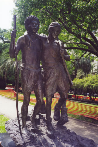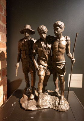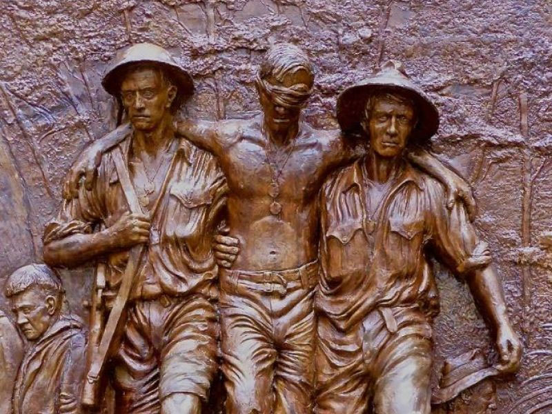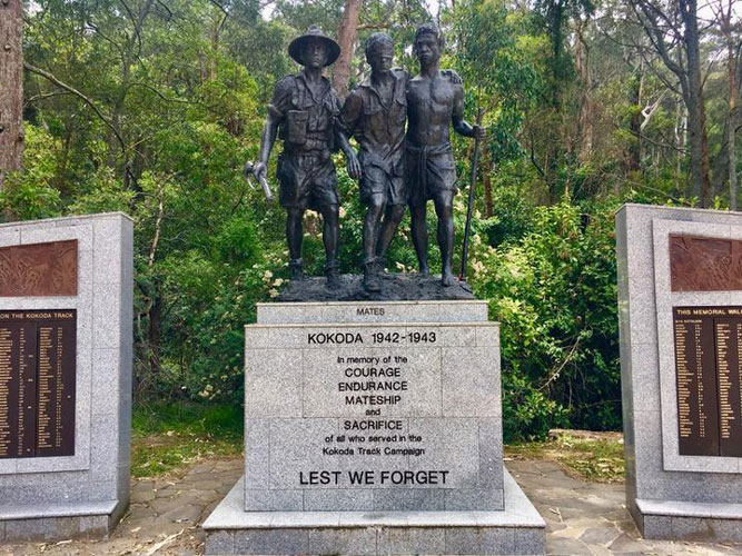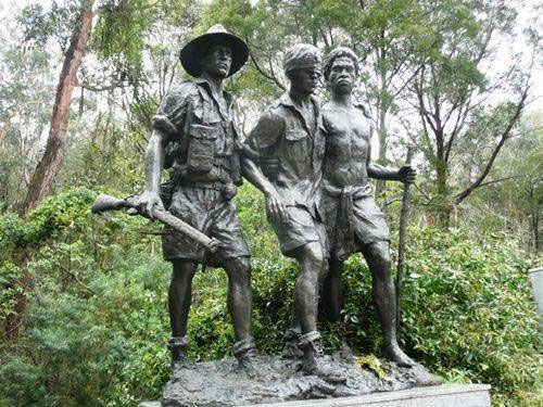 Another Kokoda Trail is in the Dandenongs it is called the 1000 Steps - Ferntree Gully (Kokoda Memorial Trail) and has a three person sculpture titled Mateship based on the 1942 Buna photograph in the use of a blinded soldier but as with the ANZAC Square monument the soldier leans heavily on the Papuan and a third fit soldier with gun accompanies them.