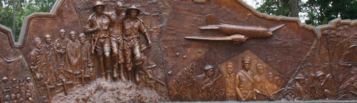 Dedicated in 2008, the images on the wall are based on the famous photos taken by wartime photographers and correspondents Damien Parer and George Silk, and are impressed onto seven panels The undulating upper edge of the installation follows the line of the track over the Owen Stanley Ranges. A relief map shows the rugged topography over which the almost 100 kilometre track passes.