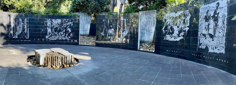 The Memorial Centrepiece features iconic images sandblasted onto the walls on themes of The Golden Stairs, Return From Isurava, Forward Scouts, Mateship, Fuzzy Wuzzy Angels. Each of these signifies qualities of ‘courage’, ‘endurance’, ‘mateship’ and ‘sacrifice’ of those who fought in the campaign. The 1942 photograph is one of five graphic rendered plaques after photographs. The complex is multifaceted and the allows for quiet contemplation.