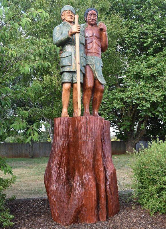Wood sculptures also exist as in the work War Memorial Park, Scottsdale Tasmania by Eddie Freeman dedicated in 2017 which is coloured giving quite a different feel to the usual renditions of the image. Here Whittington has his arm around Oimbari’s neck.