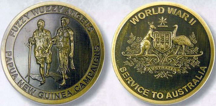 The 1942 Buna image has been the model for medallions. The medallion was announced by (Australian) Prime Minister Kevin Rudd and (PNG) Prime Minister Sir Michael Somare on April 28 2009. 1,500 Commemorative Medallions featuring the image from the photograph were minted at Royal Australian Mint Canberra for presentation to surviving members of PNG civilians who worked with Australian troops during the war.