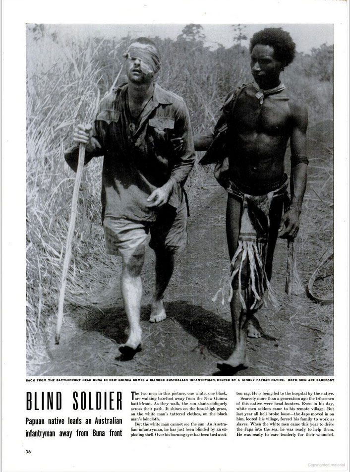 Without clearance, Silk sent the image of Whittington and Oimbari to LIFE magazine. Executive Editor at LIFE Wilson Hicks had already run an image of a New Zealand cow sent by Silk in the February 1943 issue. The New Guinea image was published on 8 March in a small 'Picture of the Week' column under the heading; “BLIND SOLDIER: Papuan native leads an Australian infantryman away from Buna front”.