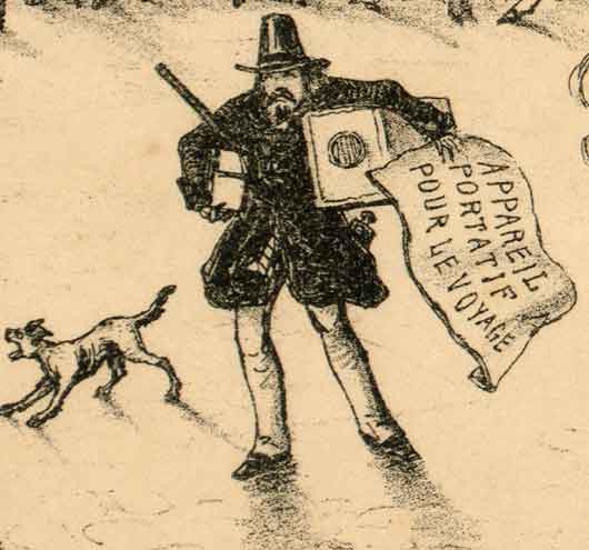 In Maurisset's image we see swirling crowds of fashionable Parisians seeking all manner of photographic experiences while out of work artists are shown committing suicide in despair. Trains and steam ships loaded up with cameras can be seen in the background of La daguerreotypomanie. In the foreground a jolly young gent in black suit carries a daguerreotype camera, tripod, and chemicals (fig. 2), captioned as his "appareil portatif pour le voyage" (traveller's portable camera outfit), under his arm, and Daguerre's manual of instructions tucked in his pocket.