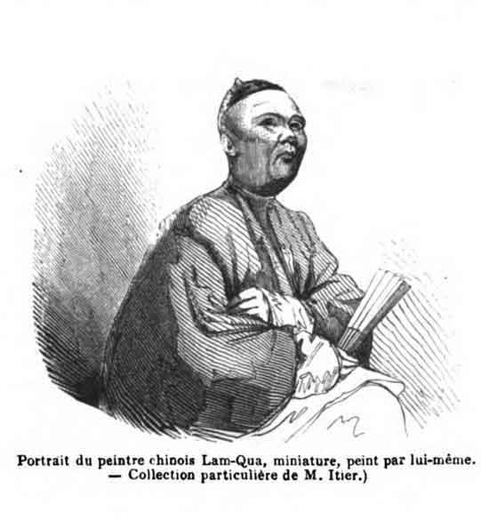 Fig 7: Portrait of Chinese painter Lam Qua, miniature painted by himself. Print, Collection de M, Itier in L’Illustrations Journal universel, no, 182, vol. 7 (22 August 1846) p. 393, Hathi Trust and University of California Libraries. |