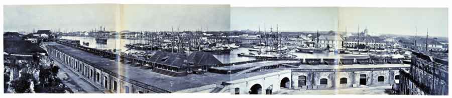 Johnson and Henderson compiled some of the first published albums in Asia: their Costumes and Characters of Western India and Photographs of Western India appeared between 1855 and 1862. This album included a three-panel panorama of Calcutta from Saint Thomas Cathedral (made around 1855 and measuring 20 by 78 cm) - one of the earliest in this format in Asia. The large format and rich tones of the wet-plate photographs enabled a real panorama of scenes and images of the many races and cultures (fig. 12). The prints had a veracity of raw detail that drew on all the established genres of topographical views, and occupation and costume studies. Above all else the photographs powerfully captured a sense of the activity on the docks, in particular the Parsee merchants involved in the cotton trade. Not all the images in the published albums were by Johnson or Henderson.