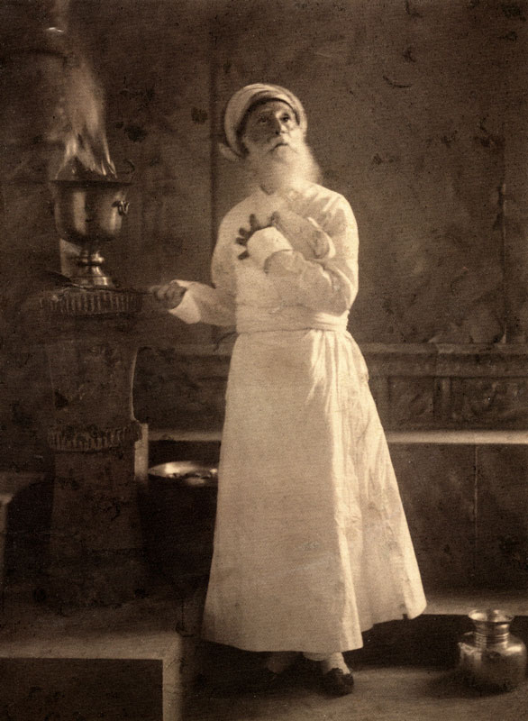 His most distinctive work is a series of images illustrating Zoroastrian religious life. Very few photographs of their religious ceremonies had ever been made public before this series as only Parsis would have been allowed to participate. The Naver—invocation is the first in the series and shows the initiation of a young Zoroastrian priest, the old priest calling on the Almighty to aid the young initiate in his work. |