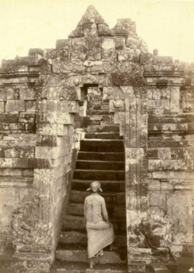 Man Climbing The Front Entrance To Borobudur,