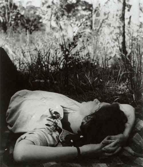 Sleeper 1939, Olive Cotton's graceful study of her friend Olga Sharp resting while on a bush picnic, made around the same time as Dupain's Sunbaker, presents a different take upon the enjoyment of life in Australia.