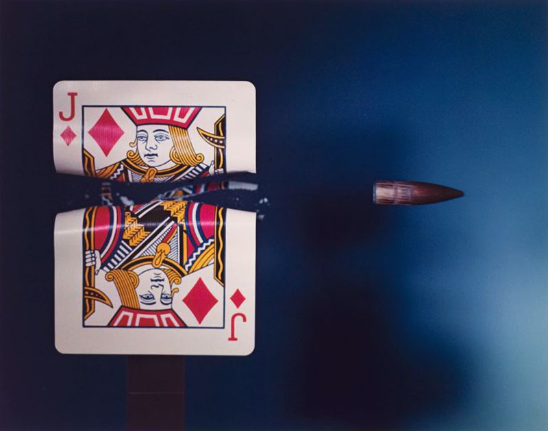 Why the bullet? Simply because of its speed, a terminal velocity which the shutter has to match? Or is it because the innocent objects on which it wreaks havoc are symbols of absolute defencelessness? Or in the case of the playing card, absolute power.4