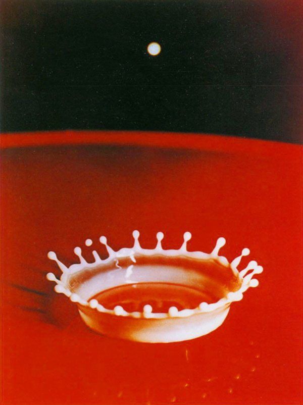 This was in black and white; numerous colour versions soon followed including the current icon, first made in 1957, where the splash appears to float lotus-like in a crimson lake whose horizon rises to meet a black sky. The incoming pearly droplet is poised above – a parody of a moonrise. Edgerton repeated the shot many times, as did his students, seeking the moment in which the coronet drops were all perfectly formed. Less seriously, the image has a distinct cartoon aura in which a 'froggy' creature's mouth is wide open waiting for the next drop.