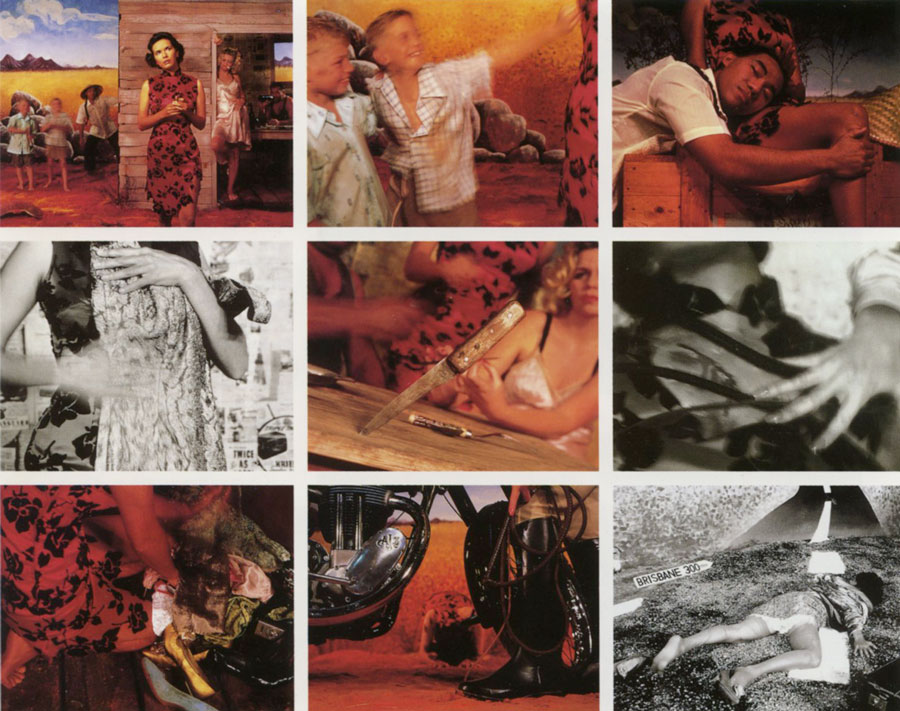 The next image rocks back and forward in time between such moralising story pictures of the nineteenth century as Holman Hunt's The Awakening Conscience, 1853, as well as a stream of B-Grade movies of the 'country girl leaves faithful/ordained boyfriend for the wilds' kind (a theme also found in Charles Chauvel's 1955 feature film Jedda, a film about an Aboriginal girl, the starting point of Moffatt's short film Night Cries, 1992).