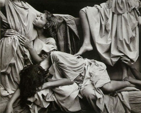 Western figurative narrative. The Scenes (the very title with its theatrical and cinematic reference acts as a warning that the issues are from the present) present cool and melancholy arrangements of young girls in crudely fashioned Greek chitons which appear as enactments from fragments of a lost classical bas-relief for which we can never know the full story.