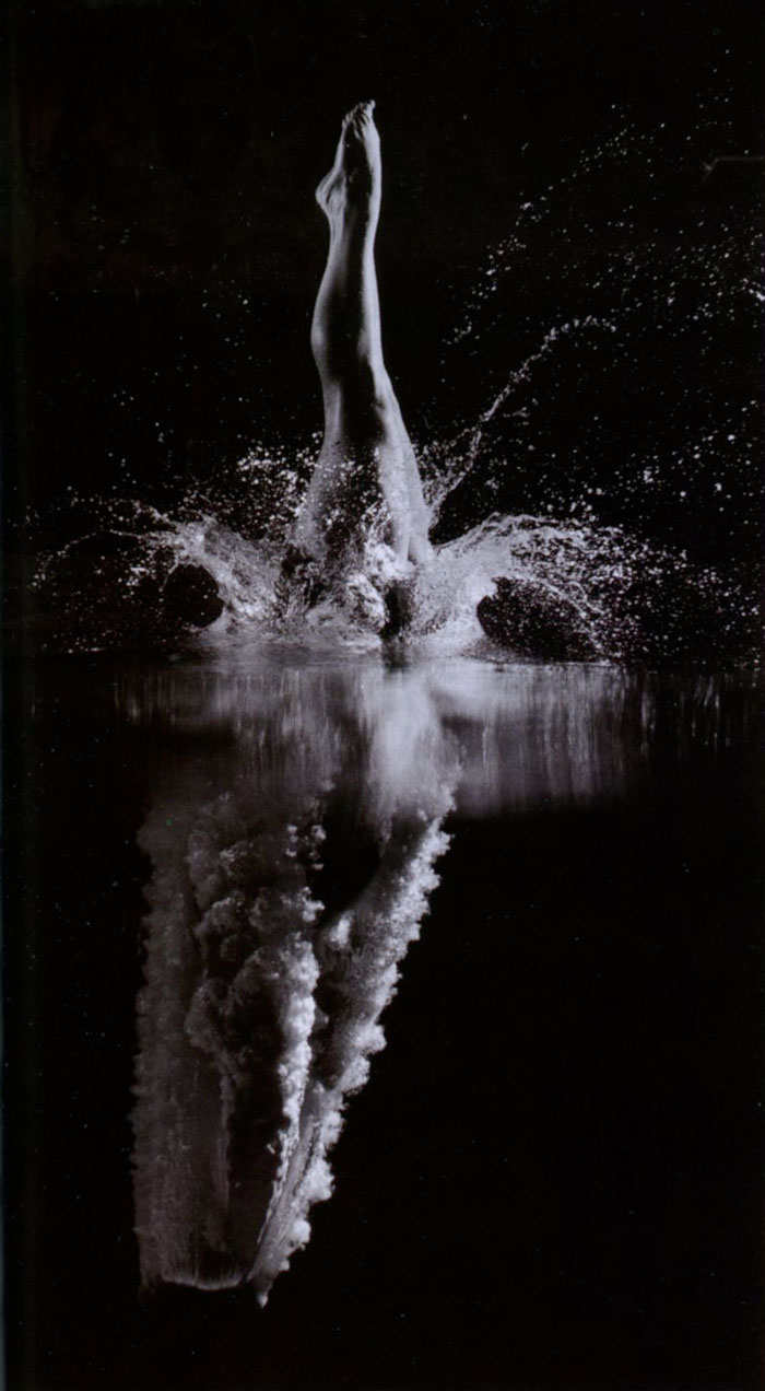 Another assignment resulted in Silk's captivating images of the young champion high-diver Cathy Flicker. Silk lowered the water level of the indoor pool at Princeton University so that a side window was midway above the waterline, enabling him to show her knife-like entry into the water and emergence in a cocoon of plume.