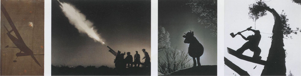 left to right: One of my models r. 1932 reproduced from Silk's earliest photographs © George Silk; New Zealand anti tank outfit firing 23 pounder gun at night against German position, Western Desert 1941 © Australian War Memorial; My favourite cow. Spring in New Zealand 1942 © George Silk; Timber felling. King Country, New Zealand 1946 © George Silk