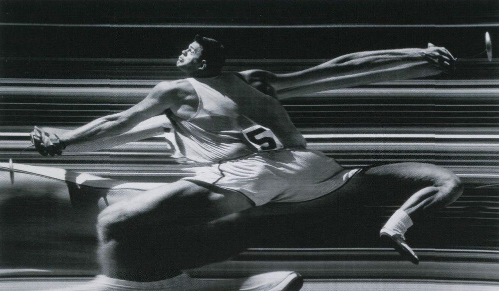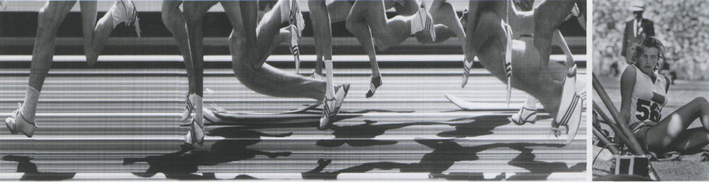 The image produced by the slit camera turned the hammer thrower at the U.S. try-outs into a cartoon strongman, but also conveyed the intensely private moment of the athlete straining in his endeavour to win. The slit camera picture were quite abstract — Silk said: 'I was thrilled when the prints showed strength, speed, design — originality.' For the try-outs story in Life, 18 July 1960, Managing Editor, Edward K. Thompson ran the slit camera images as large illustrations alongside straight shots of the winners. |
