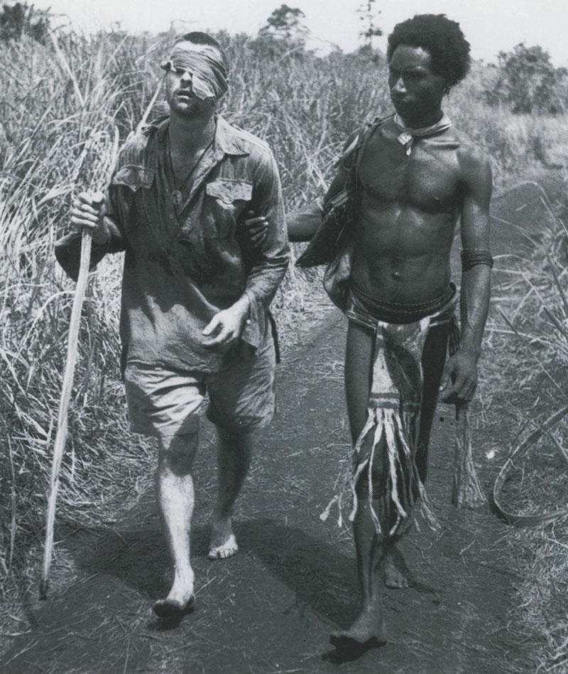 (Pte George Whittington being led to an aid station by Raphael Oimbari)