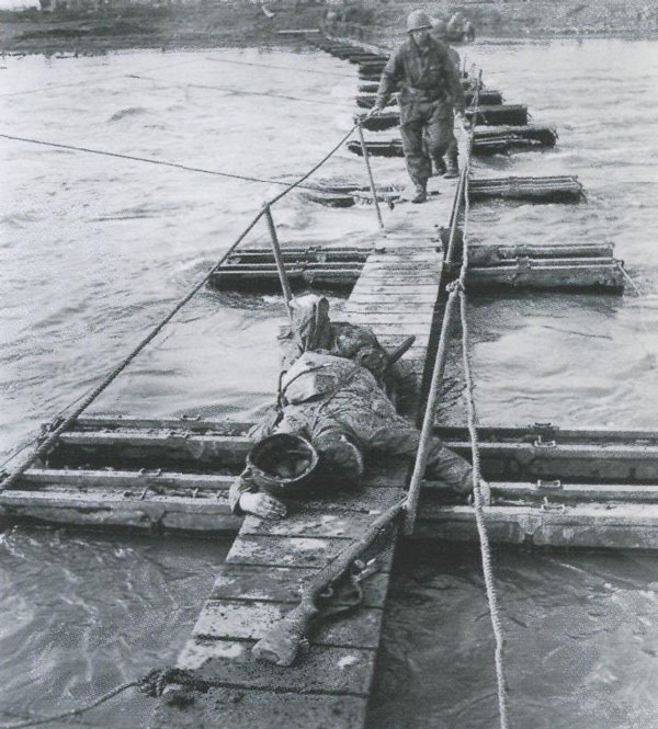 | Dead American soldier on pontoon bridge across the Roer River, Germany 1945 © Time Inc. |