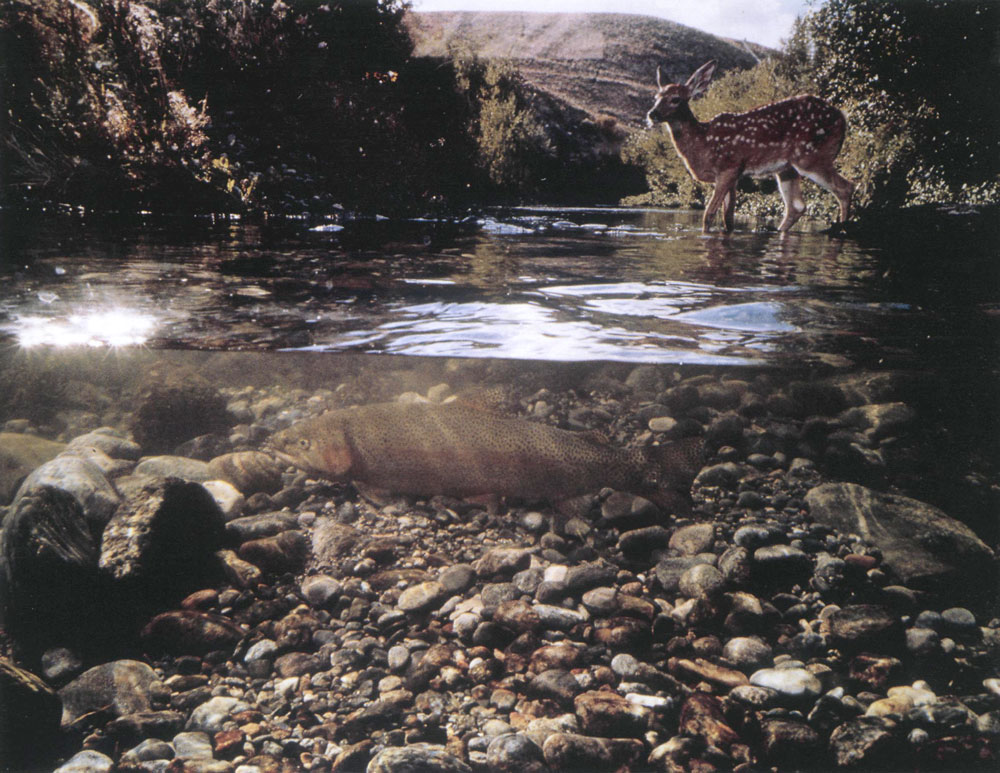 To make this picture he used his knowledge of the way spawning trout react when disturbed: '... I moved some rocks to make the water flow in a way attractive to spawning trout.' Silk waited more than a week for all the elements to come together. To show the trout and fawn together he enclosed his camera in a large glass box submerged half-in and half-our of the water and set the exposure from some distance away by a cable release.
