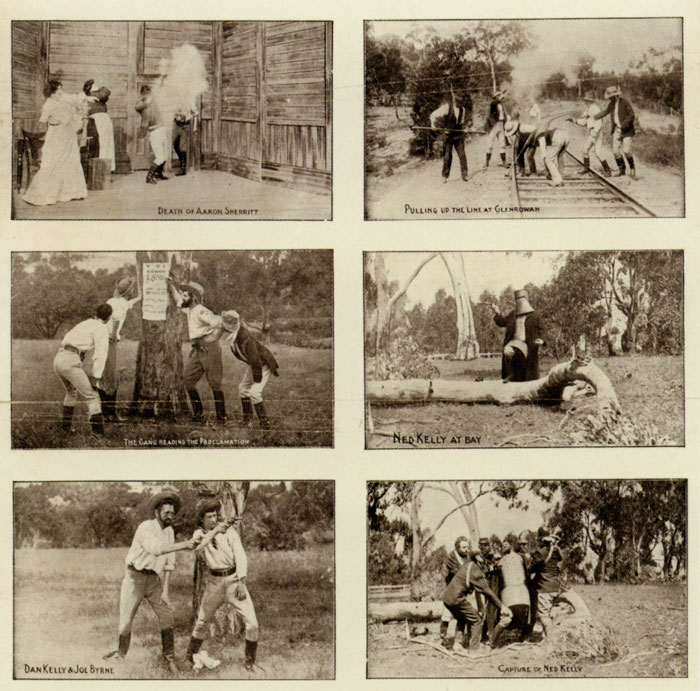 The mobility of the new filmed narrative can be seen in the lively mix of indoor and outdoor action stills on the poster for the Tait brothers' pioneering The Story of the Kelly Gang (1906), thought to be the world's first full-length, narrative feature film.