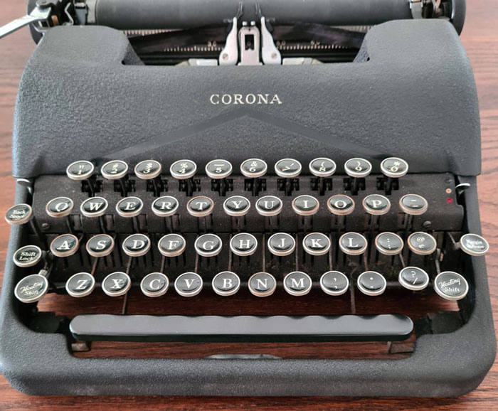 My mother had a portable typewriter, a Smith Corona. Heavy, cold and patinated with a funny tough paint in battleship grey like a wrinkled old lemon peel. The keys were smooth raised letters encircled with little chrome rings. They required force to make the little teeth land on the paper. I was always fascinated by her pounding away so fast without looking at the keys and regret not learning to touch type.