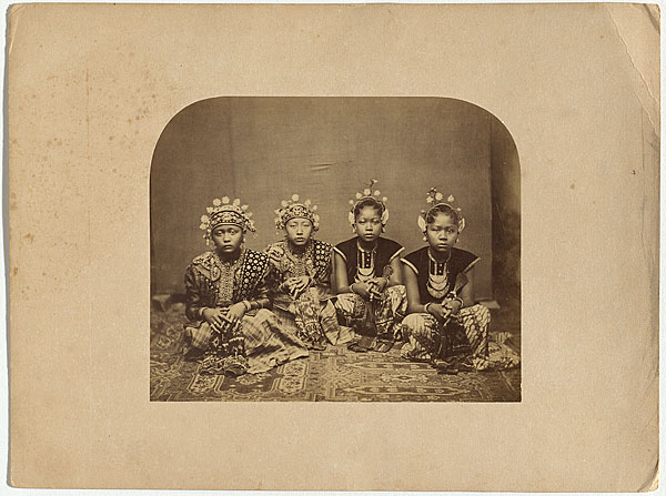 Serimpies, or dancing girls of the Sultano is one of the earliest known photographs of Javanese people and comes from a series on court dancers and musicians made circa 1858 by the Woodbury & Page studio of Batavia.