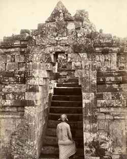 | #A18: Man climbing the front entrance to Borobudur, Kassian Cephas 1872. |