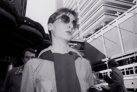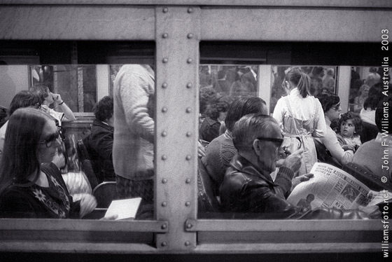 His subjects in late 1970s seem engulfed by signs and slogans, concrete and rubbish. Old people appear as being invisible to the young, looking lost in their own world and often merely glimpsed in reflections. In Williams' 1976 series on the Sydney underground rail for example, the background becomes a disintegrating and unstable environment with splayed forms and split images.