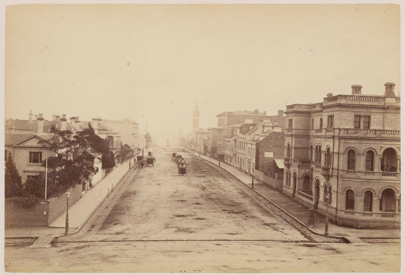 1875: View of Collins Street, Melbourne, looking west near the intersection with Russell Street.