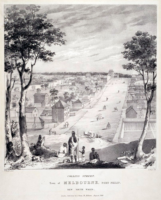 At the centre foreground of the lithograph three Wurundjeri adults and child stand on the small hill at the eastern end of Collins street at about the present day site of the Old Treasury Building. The elevated viewpoint looking west towards market street emphasises the very generous wide street plan instituted by Surveyor Robert Hoddle in 1837.