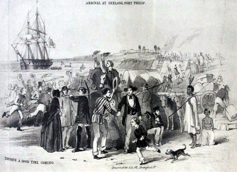 | sketch by E. Noyce. 'Arrival At Geelong, Port Phillip'. 'There's A Good Time Coming' |