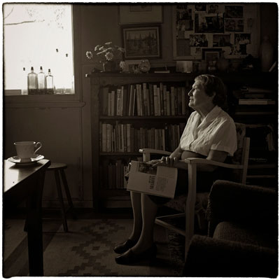 Olive Cotton whose quiet reserve as a person and whose oeuvre as a whole Adams declared he could not get, is actually revealingly portrayed with her book shelves and her placement in the room of objects recalling her iconic images of tea cups and daisies.