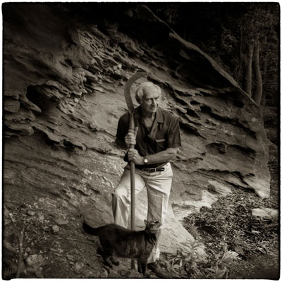 Max Dupain is shown holding a scythe and his cat in his rocky bush garden, looking a little threatening but Dupain gets the joke and casts a rare mischievousness glance to camera.