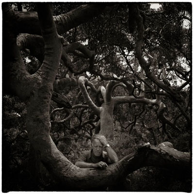 David Moore is almost overwhelmed by the angophora trees on his holiday property – the subject of his own photographs. Their writhing forms match the sensuosity and linear flows often seen in his work. Moore’s slight anxiety is also evident in being a subject instead of a maker of portraits.