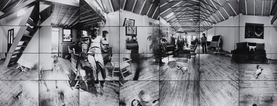 # 56 Sandra, Tom, Ariel, Rose (the cat), kittens — Newtown, December, 1979. Panorama composed of 28 silver gelatin photographs each 8.4 x 12.4 cm, shot from tripod 360° in four horizontal scans and seven vertical scans approx. 120°, overall image 33.5x 87.3 cm.