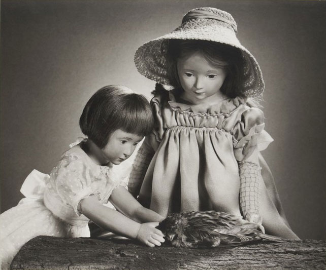 Bernhard told how she thought the Cochran dolls looked sad so as the narrative cause she added a dead sparrow she found in the snow outside in Pennsylvania where she was working at the time. The dolls are only about twelve inches high so the tiny sparrow looks big. Bernhard liked Sparrow and donated a print to Princeton Art Museum.
