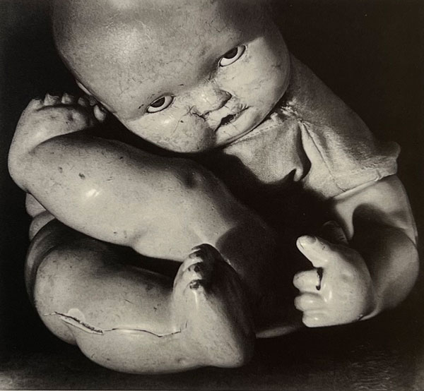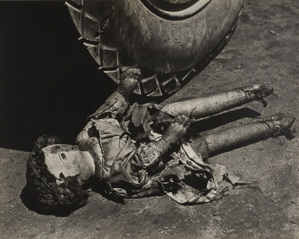 Equally sombre Italian dolls and a Buddha doll feature in works from these years. One image from 1938 is of a dirty ragged doll in the street seemingly run down by a car.