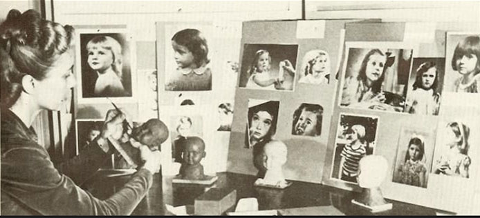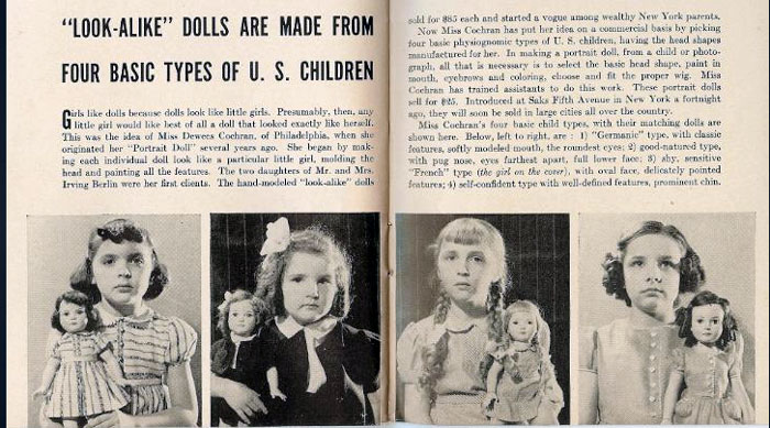 Cochran had begun began a line of custom-made dolls modelled on wealthy client’s children in the 1930s, later moving to New York to create more affordable but high-quality range of dolls. In 1936 she created six basic Look-A-like dolls with a different face shape and by changing the hair or eyes, could produce a portrait doll to fit most white children. These were often dressed in rather old-fashioned outfits. Life magazine featured Cochran dolls on the cover of the 3 April issue 1939 with an article inside on the dollmaker.