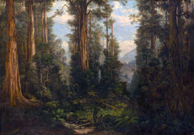 One view is majestic with powerful large straight tree trunks including one mammoth soaring upwards and a sense of a lush almost wild landscape. The image recalls the style of detailed colonial paintings for example Louis Buvelot’s 1873 Near Fernshaw (se below).