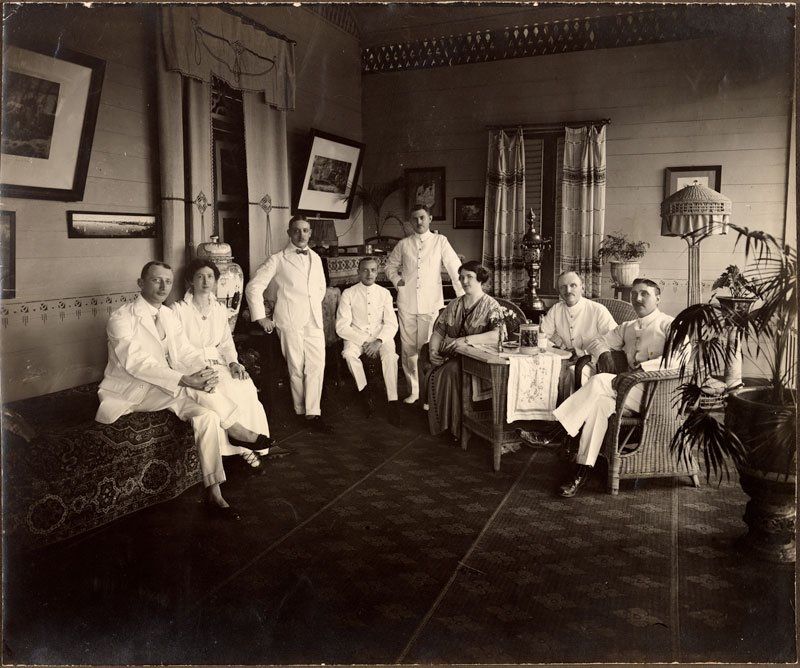 Albums from Dutch families in Indonesia tend to show off interiors more than European examples, perhaps since distant family members would never see their tropical home. They also mix the corporate and plantation images with the domestic scenes in unconscious recognition of the economic source of the family’s wellbeing. Unlike the rigid slots for portraits in nineteenth-century albums, the compilation, rearrangement and inscribing of the modern family album could show the creativity, wealth and success of each compiler. Some arrangements of photographs on the page harmonise with the patterns of wall plaques and posing.