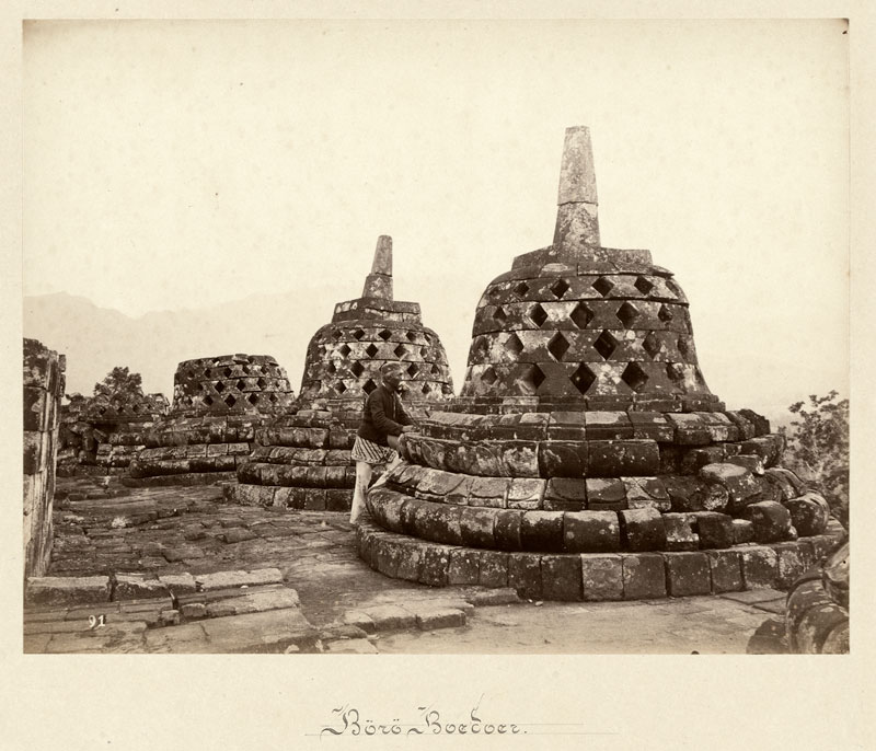 In his 164 photographs of Borobudur, taken between 1890 and 1891 for the Royal Netherlands Institute of Southeast Asian and Caribbean Studies, Céphas introduces himself to his international audience: the photographs numbered from 86 to 89 include a lonely and likeable modest figure of an elderly man with a proud moustache seated among the architectural monumentality of Borobudur. He seems to caress the stone work rather than stand upon it and is depicted as being in simpatico with his architectural surrounds, especially when compared to the usual bravado embodied by European archaeologists standing defiantly on the highest peak.