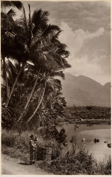However, he also made landscape photographs like this one of tourist sites popular among his well-to-do European clientele. It shows the fishponds of Cipanas at Garut in West Java with the active Mount Guntur in the background.