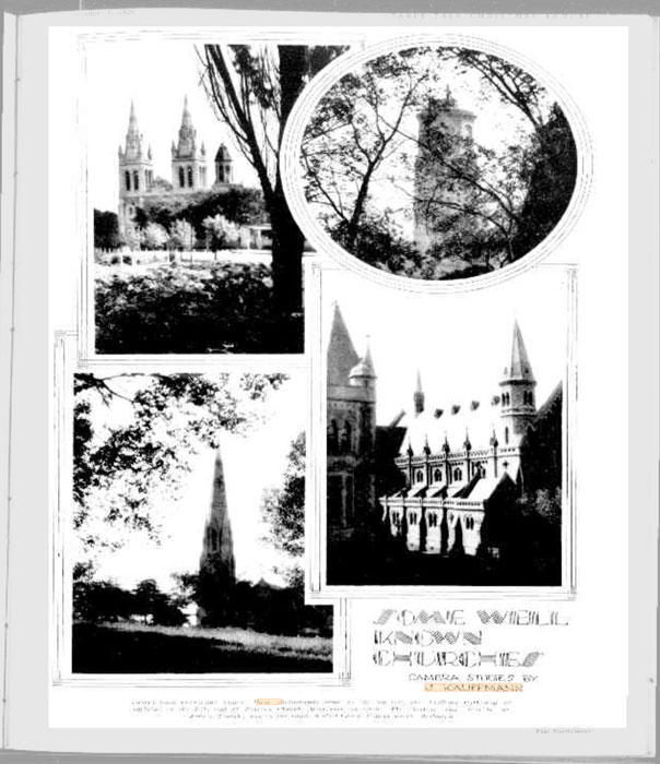 Viewed from unfamiliar angles, these photographs show, in the top row, the Anglican Cathedral at Adelaide, on the left; and St. James's Church, Melbourne, in circle. The bottom row reveals St. John's, Toorak; and on the right, Scots Church, Collins street, Melbourne.