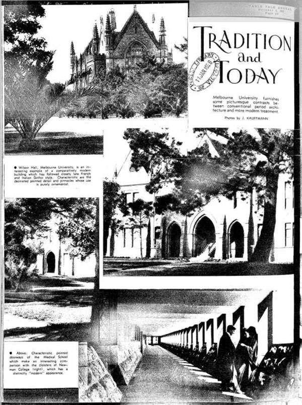 Melbourne University furnishes some picturesque contrasts between conventional period architecture and more modern treatment. Photos by J.Kauffmann